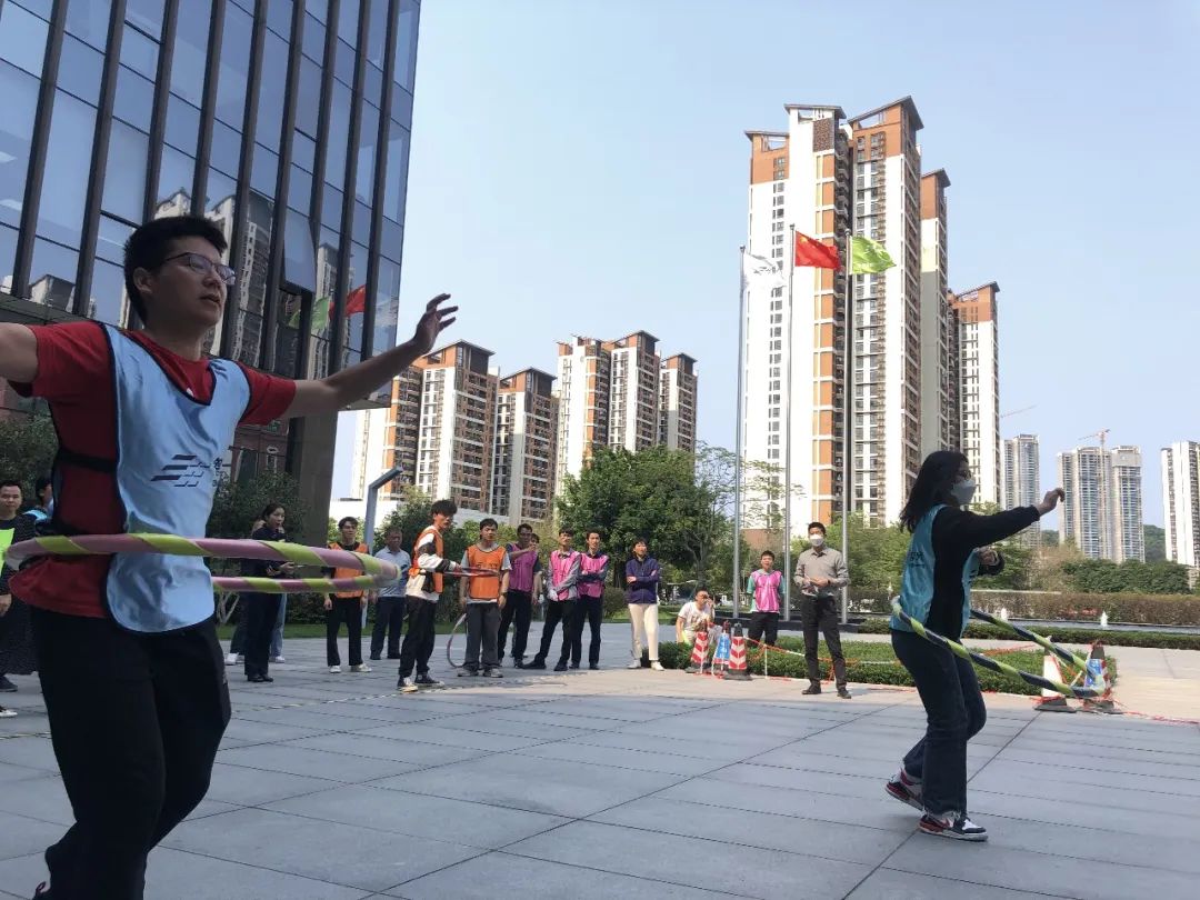 每組的10名選手,在指定的位置手拉手排成一排,在不松手的前提下,將呼啦圈從第一個人傳遞至最后一個人,齊心協力把呼啦圈穿越整個隊伍。